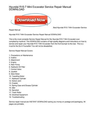 We all know that reading Hyundai Crawler Mini Excavator Robex 15 7 Operating Manual is beneficial, because we can easily get information in the reading materials. Technology has developed, and reading Hyundai Crawler Mini Excavator Robex 15 7 Operating Manual books might be far more convenient and simpler. We could read books on the mobile, tablets and Kindle, etc. Hence, there are several books coming into PDF format.